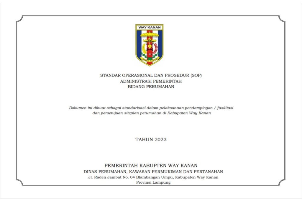 Standar Operasional Dan Prosedur (SOP) Administrasi Bidang Perumahan. Dokumen ini dibuat sebagai standarisasi dalam pelaksanaan pendampingan / fasilitasi dan persetujuan siteplan perumahan di Kabupaten Way Kanan TAHUN 2023